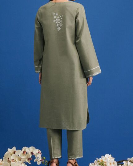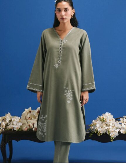Army-Green Cross Hatch Embroidered Co-ord Set – Straight Fit, V-Neck & Full-Length Sleeves