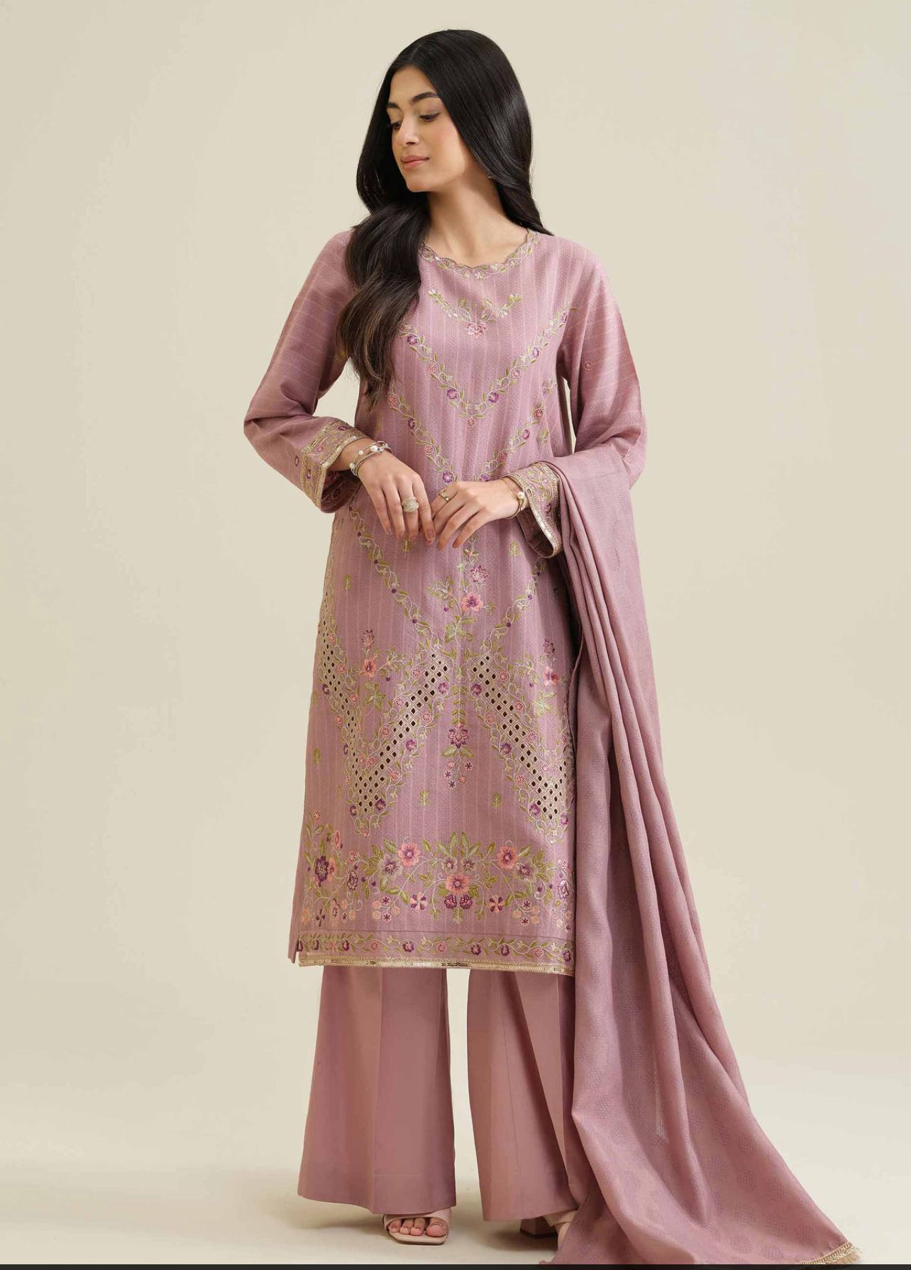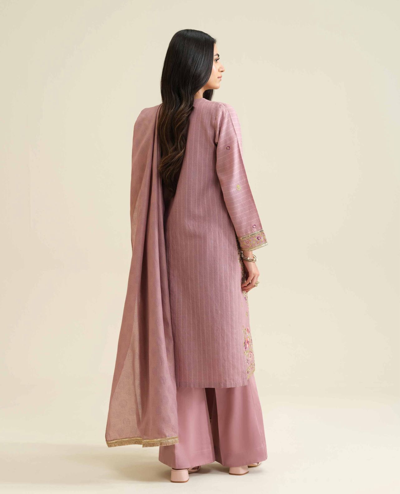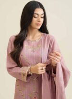 An elegant classic outfit designed with refined details and graceful finishing. The shirt features beautiful border embroidery on the front, delicately enhanced with lace and pearl embellishments for a sophisticated look. Paired with a matching fancy jacquard dupatta and sleek sateen trousers, this ensemble creates a perfectly coordinated and festive appearance.