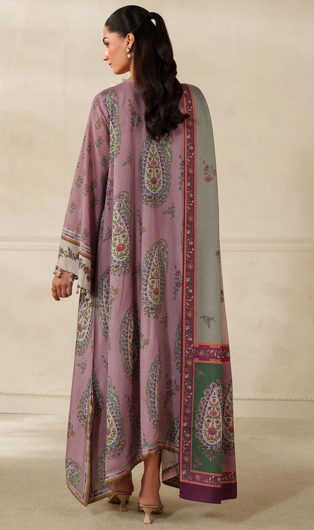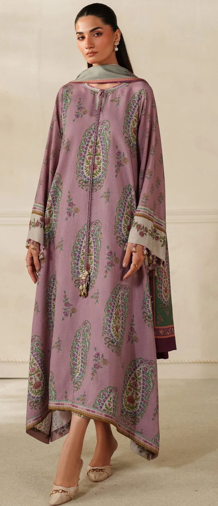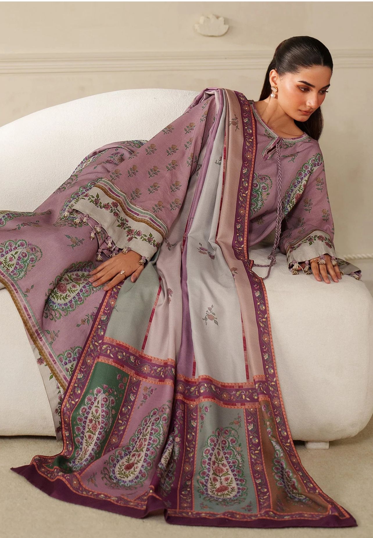 The ensemble is completed with a luxurious digital printed pashmina shawl, offering both warmth and a refined finishing touch. Perfect for winter gatherings, casual outings, and everyday wear, this stitched outfit blends tradition with modern design.