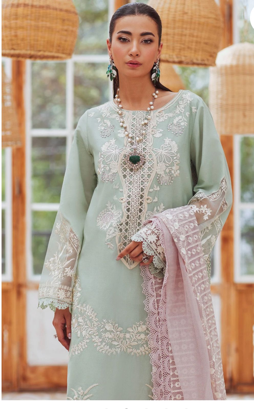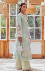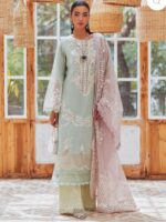 Refresh your wardrobe in serene Aqua. This ready-to-wear 4-piece set includes a dobby-textured shirt, soft cotton trouser, matching undershirt and a breezy woven-net dupatta—everything you need for effortless spring elegance.