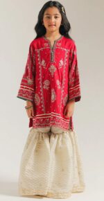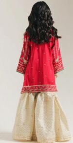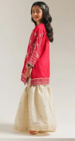 This enchanting Ethnic kids suit is a beautiful blend of rich color and intricate detailing, designed to make special occasions truly memorable. The pink tunic is adorned with elegant gold, green, and white embroidery across the front and sleeves, creating a festive and graceful look. It is paired with a flowing gharara in a complementary wine-gold tone, featuring a subtle woven pattern that adds depth and charm.