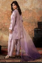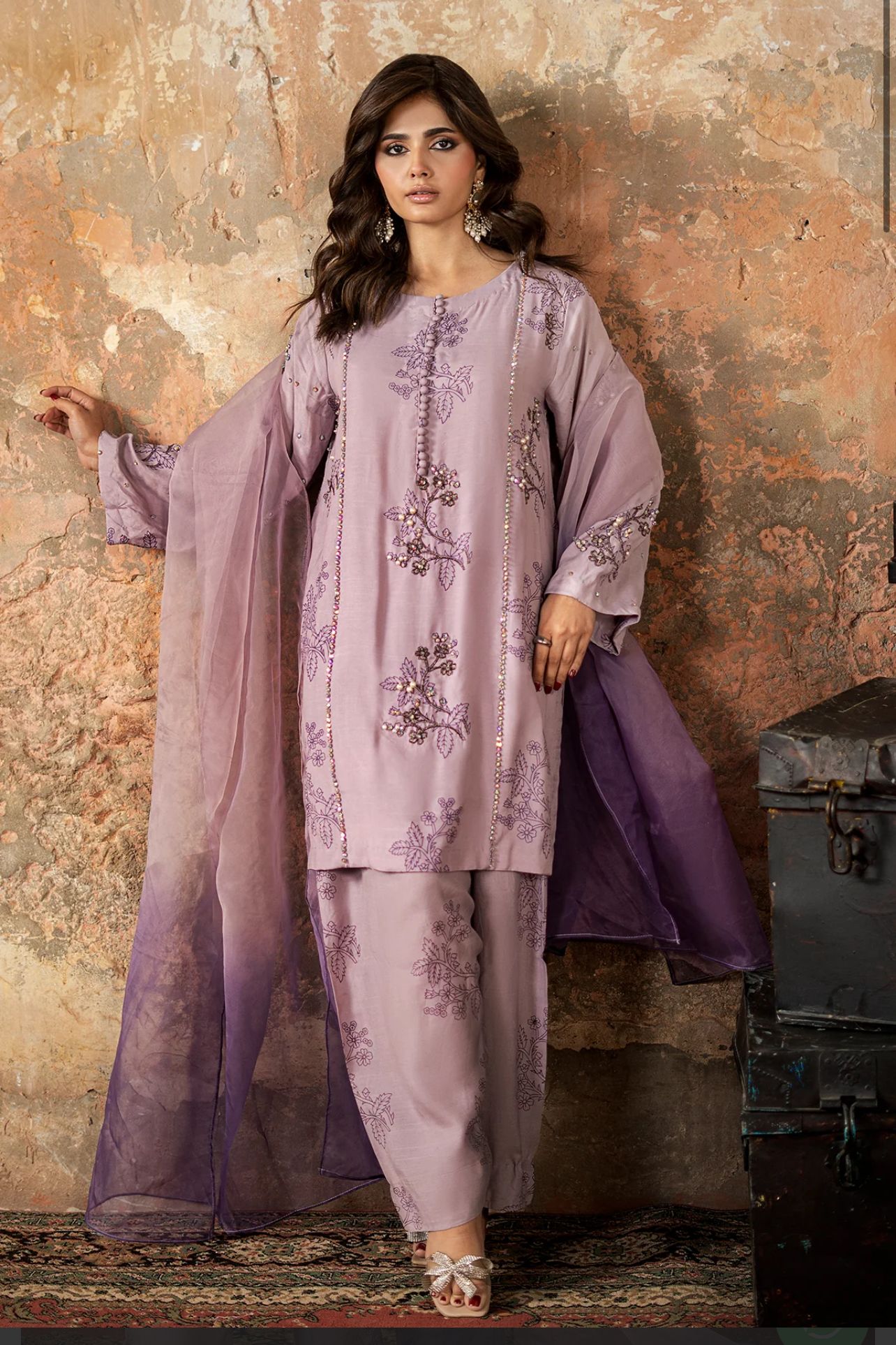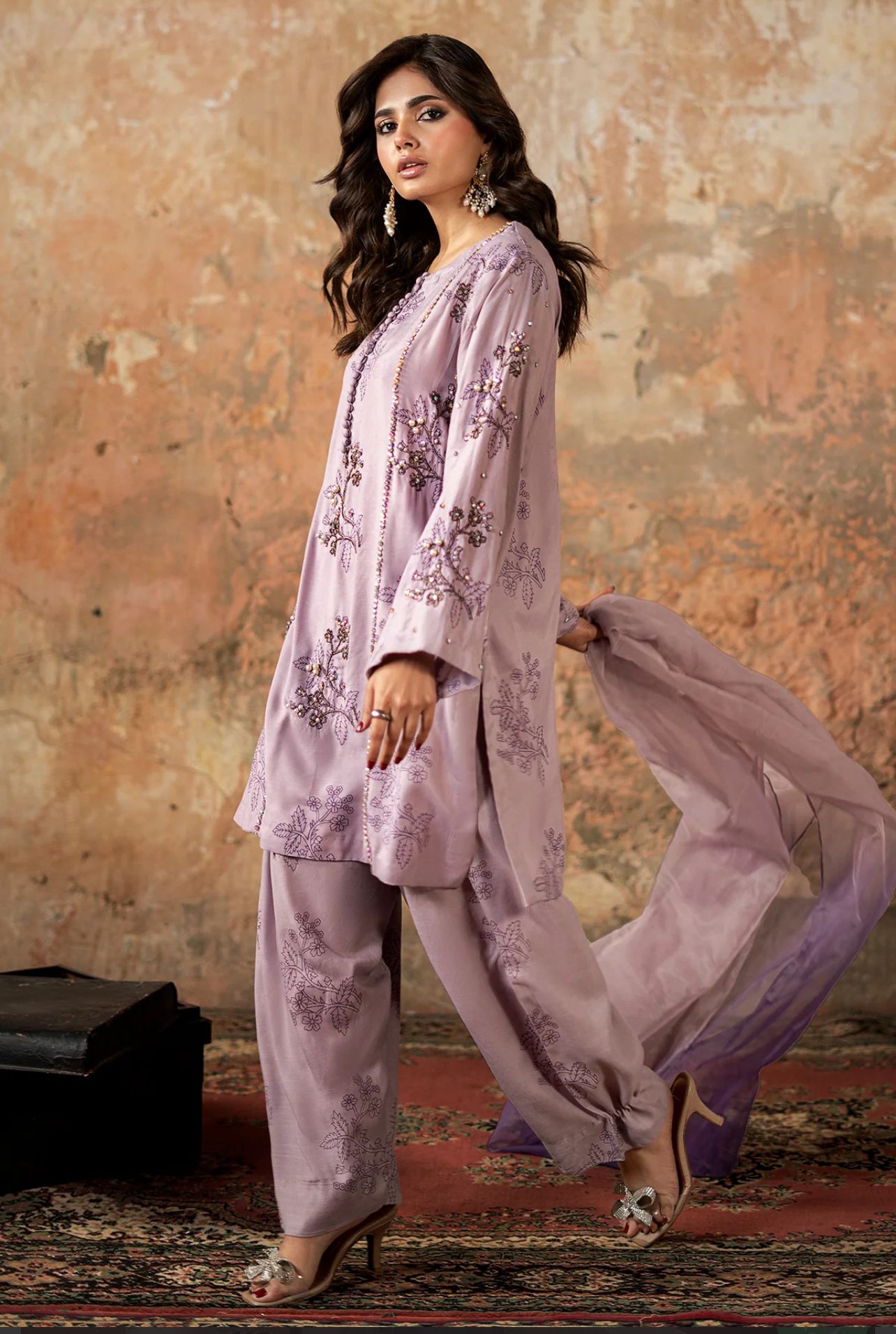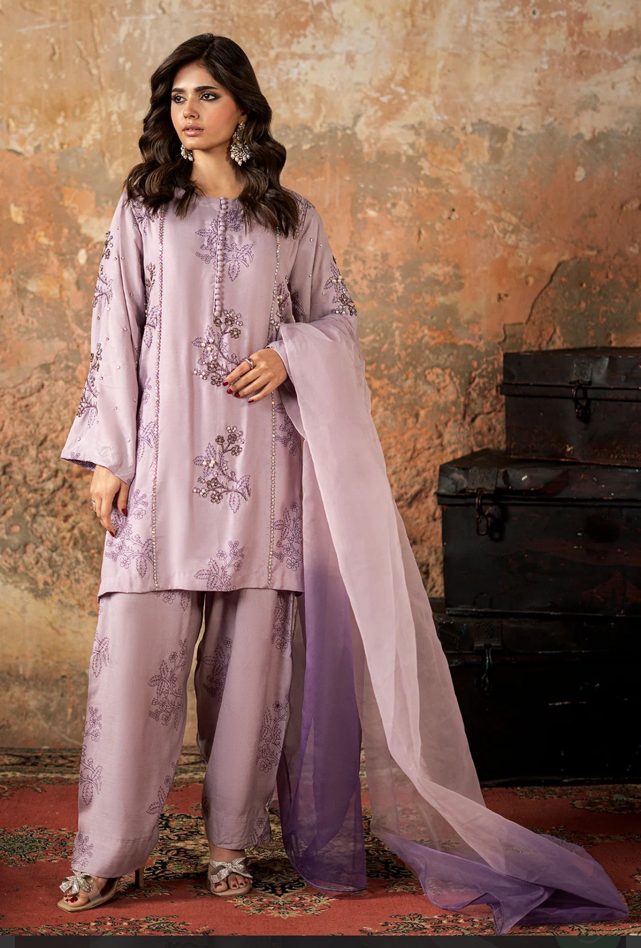 A harmonious blend of tradition and artistry, this elegant lilac raw silk tunic is adorned with exquisite hand embellishments and refined French buttons, enhanced by delicate block-printed details that add depth and texture to its graceful silhouette. Paired with a matching raw silk shalwar, the ensemble reflects understated sophistication. The look is beautifully completed with a dark purple ombré dupatta, adding a rich contrast and timeless charm—perfect for festive and semi-formal occasions.