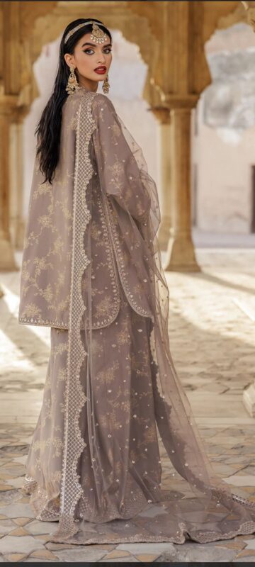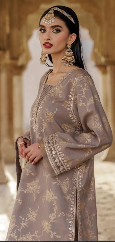 Raw Silk Printed Shirt with embroidered neckline & sleeved finished with organza fashion & embroidery patti .Finished with Stitching detail.