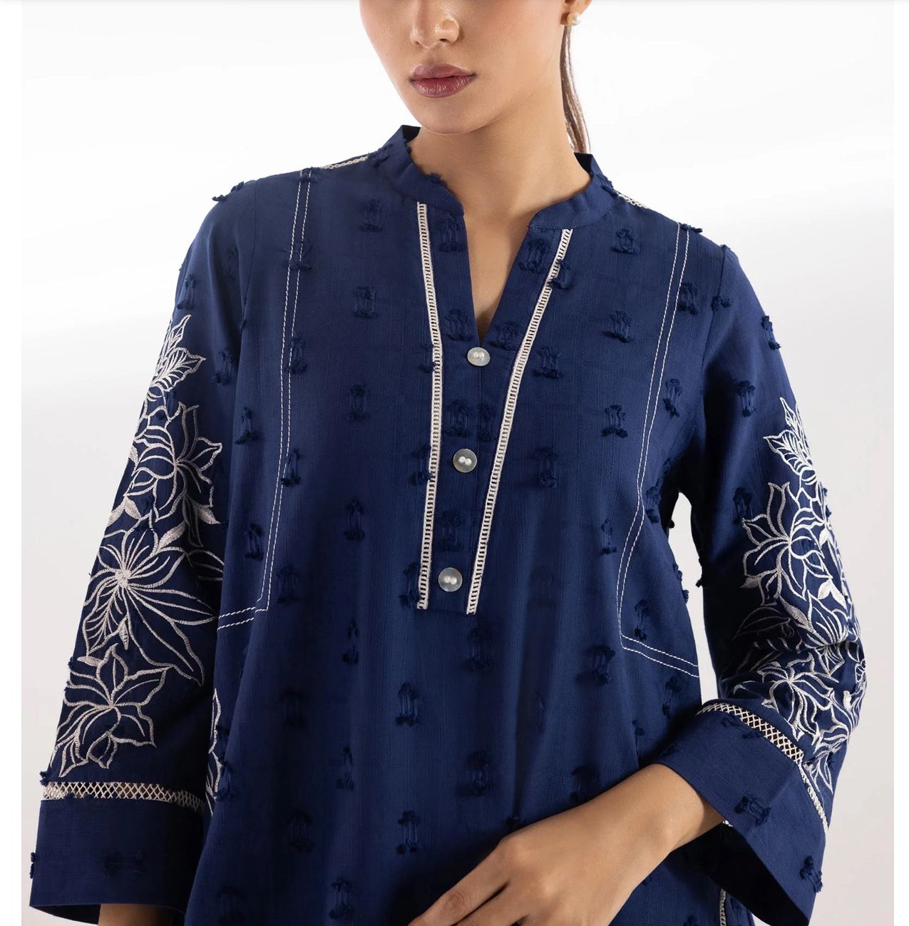 Elevate your everyday wardrobe with this elegant Sana Safinaz shirt, crafted in a rich navy tone for a timeless and versatile look. Designed with a basic cut, it offers effortless comfort while maintaining a refined silhouette. The shirt is made from Cotton Brochia fabric, featuring subtle jacquard detailing that adds texture and sophistication. Perfect for both casual wear and semi-formal occasions, this piece blends classic style with modern grace.