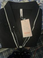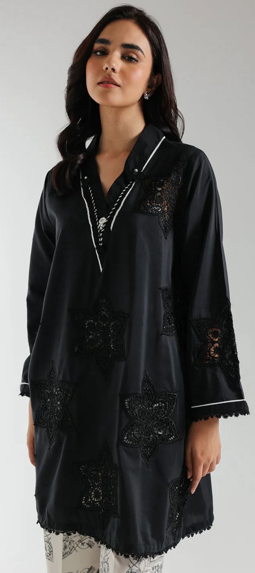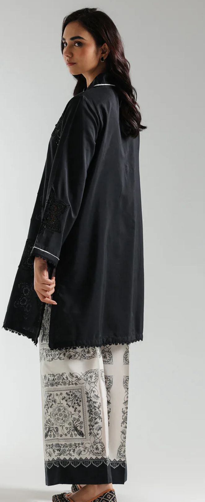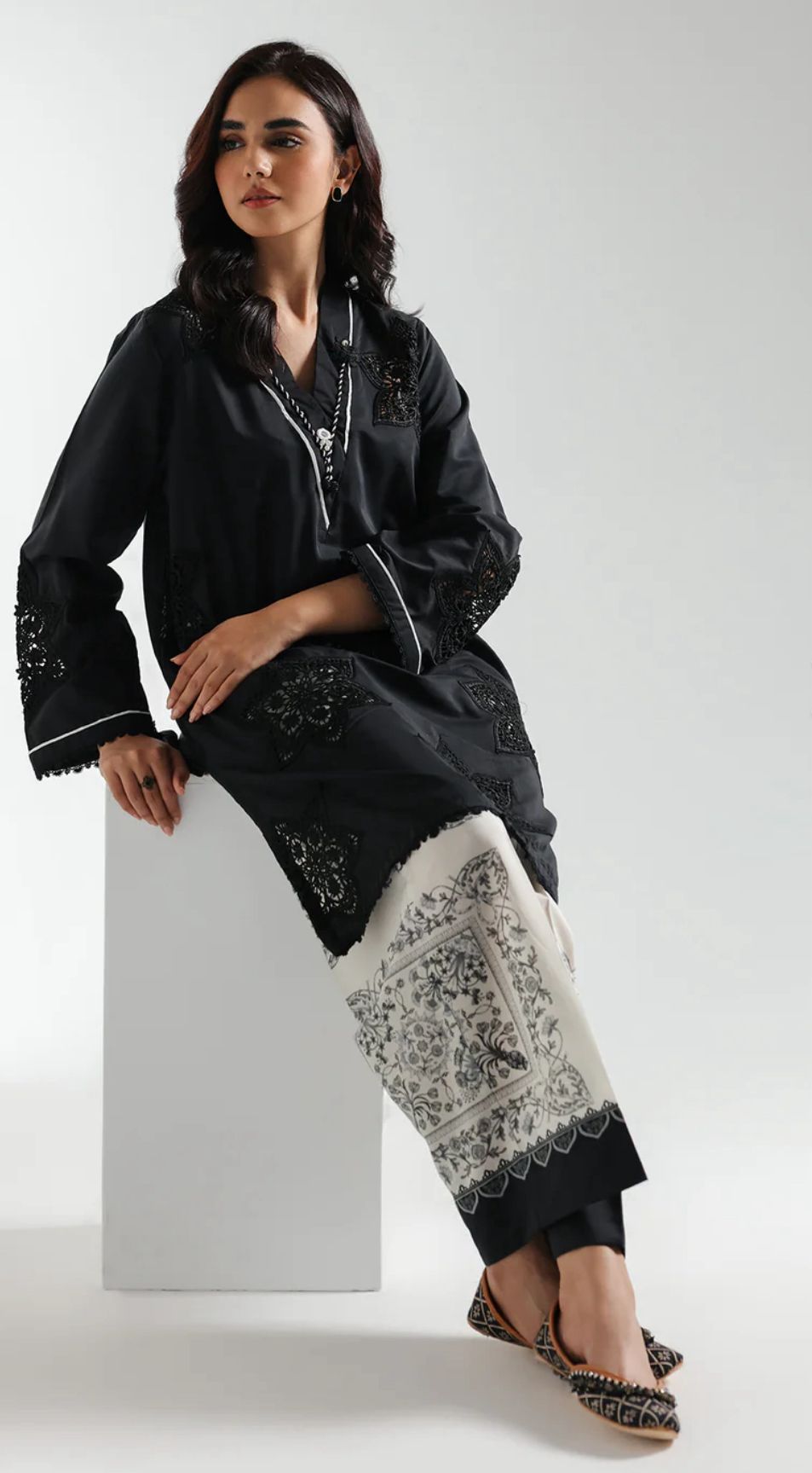 Effortlessly elegant, this jet-black stitched set pairs a modern V-neck shirt—richly embroidered with intricate schiffli florals and framed by scalloped lace at the sleeves and hem—with a fashion-forward printed culotte. A fresh, must-have duo for your spring wardrobe.