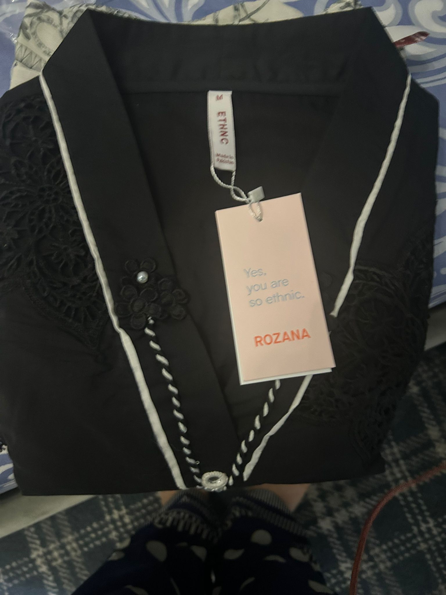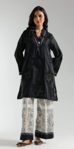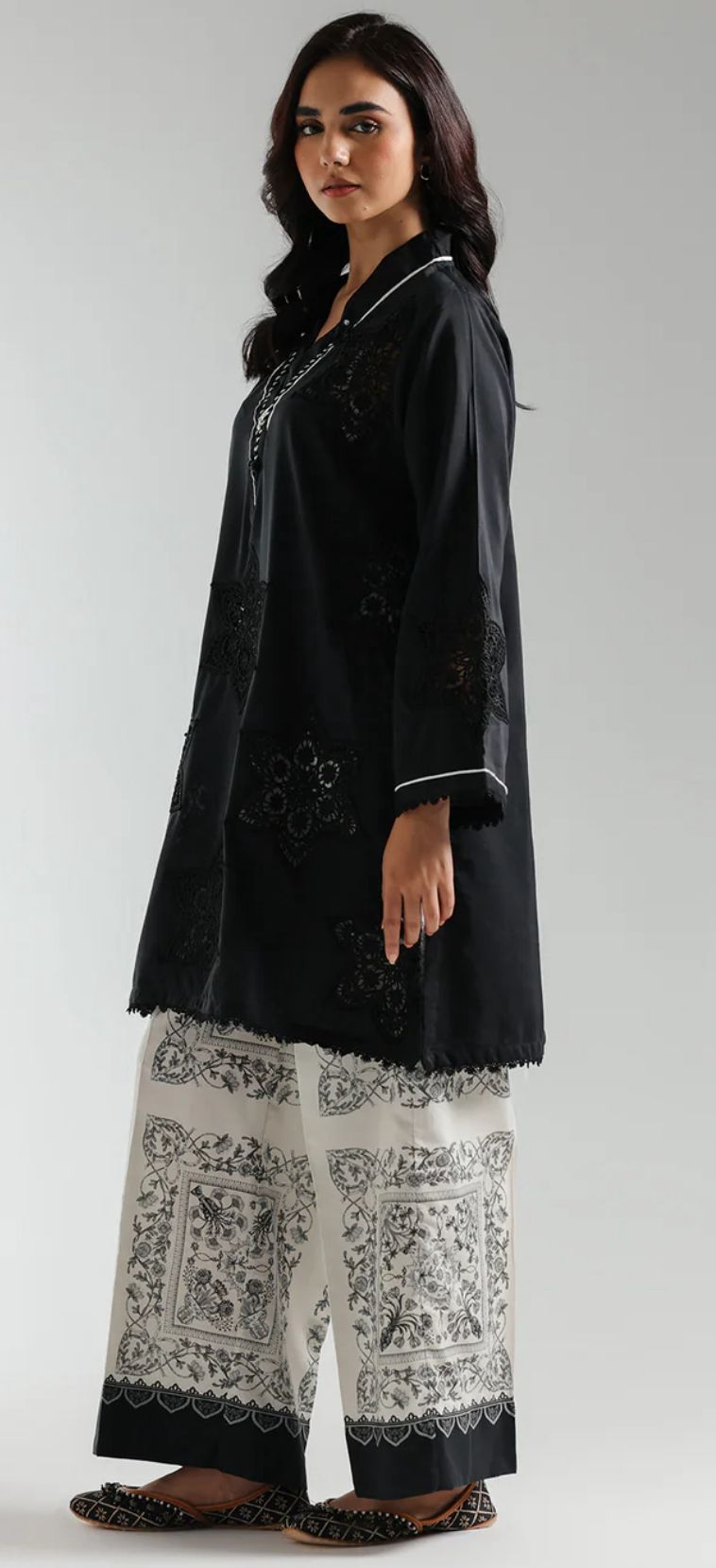 A classically chic composition is portrayed on this style statement outfit. It features a contemporary deep black shirt beautifully adorned with captivating floral designs embroidered with intricate schiffli technique and enhanced with scalloped lace at sleeves and bottom opening. Paired with a trendy printed culotte trouser adorned with attractive prints. A great addition to your spring season wardrobe.