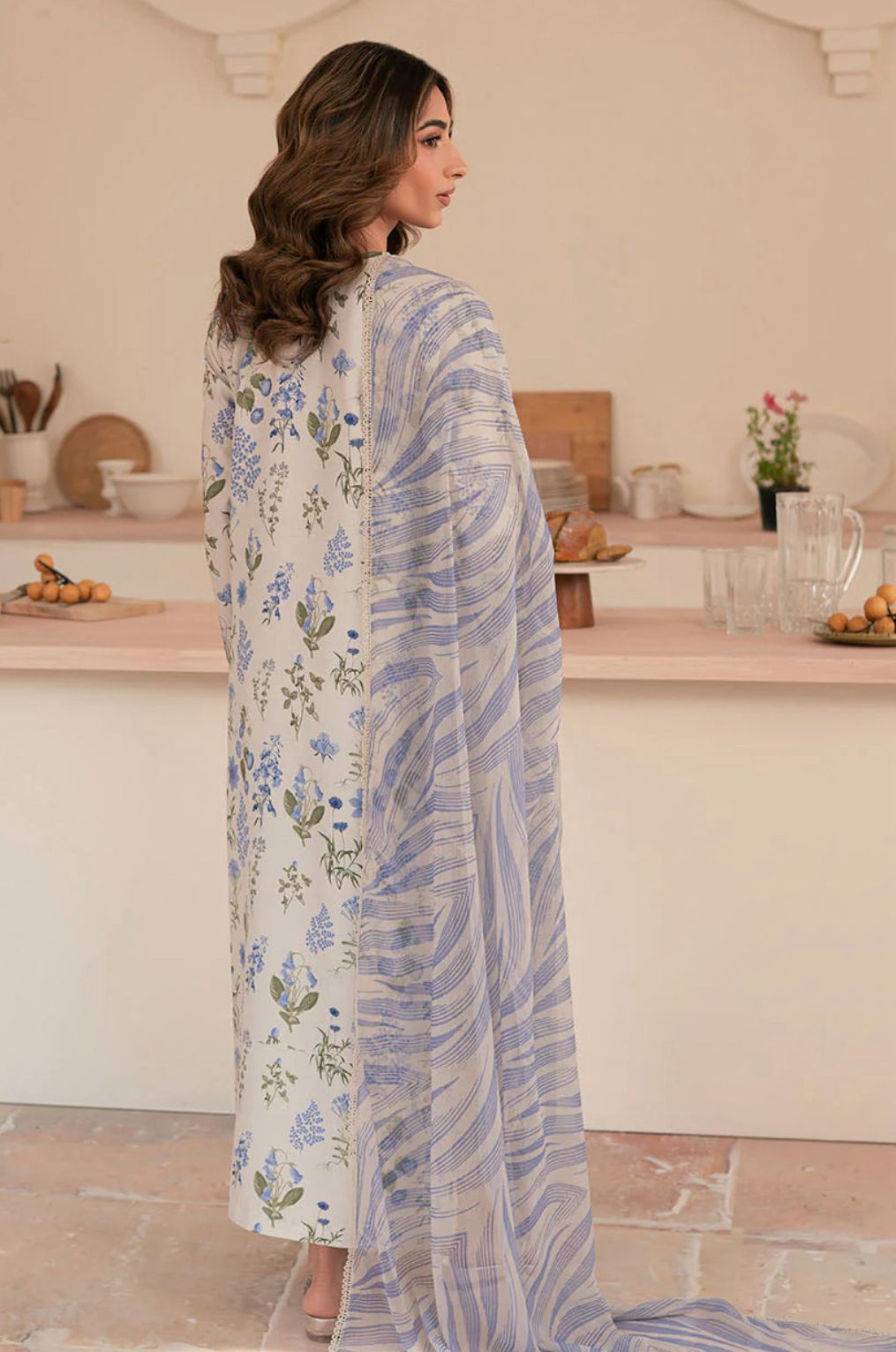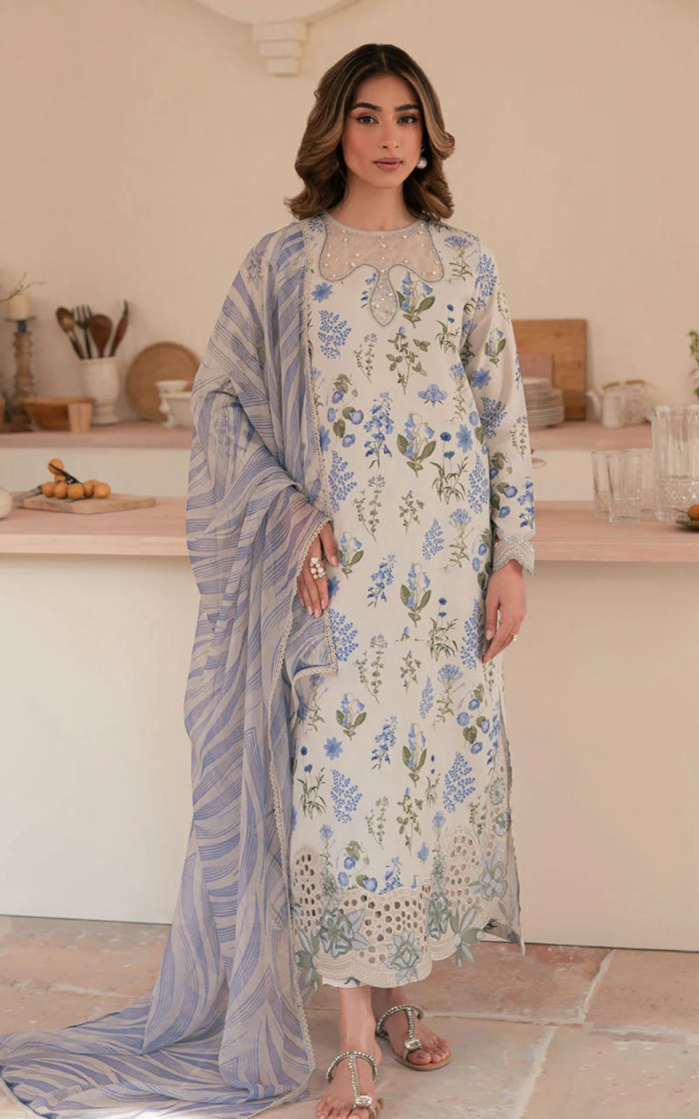 It is paired with stylish chiffon crushed sharara pants, adding volume and movement to the outfit, while the embroidered chiffon dupatta completes the ensemble with a delicate and sophisticated finish. A perfect choice for weddings, parties, and special celebrations.