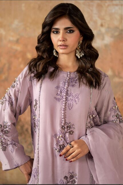 Sable Serenity:3pc Suit with Floral Embroidery, Pearls & Organza Dupatta